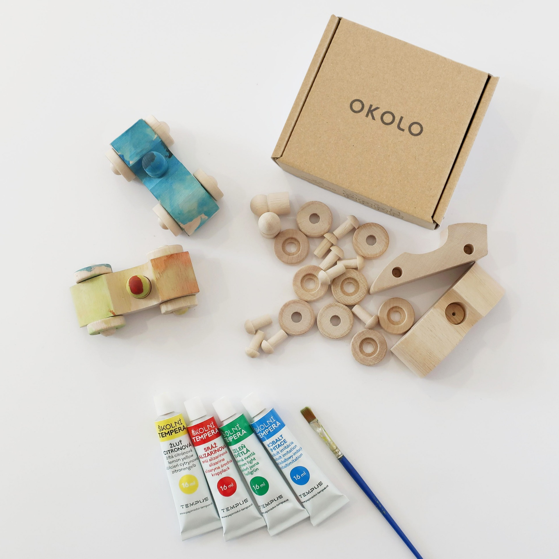 Sada neobsahuje lepidlo ani barvy. Na barvení můžete použít vodové barvy, tempery, akrylové barvy na dřevo, fixy i pastelky. Pro nalepení koleček použijte bílé lepidlo (např. herkules)